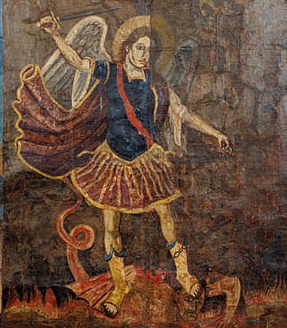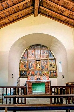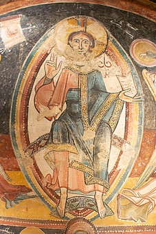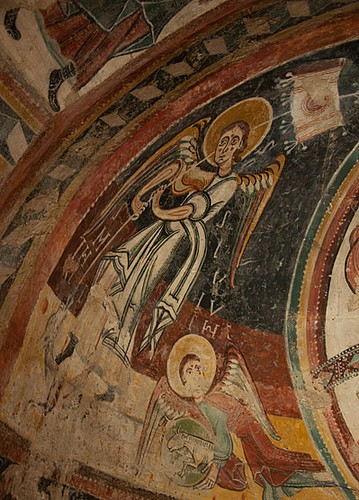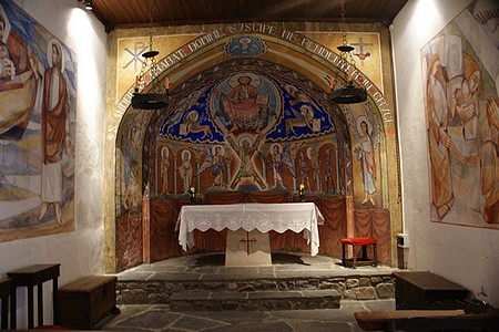 Az apszisban egy fantasztikus freskó látható, az eredeti freskók reprodukciója. Az eredeti falfestmény a barcelonai múzeumba került, ezek voltak az első andorrai román stílusú falfestmények, amelyeket a barcelonai Múzeumi Tanács szerzett meg, 1921-ben vásárolták meg őket, miután La Seu d'Urgell püspöke engedélyt adott a tranzakcióra. Ez akadályozta meg, hogy más gyűjteményekhez hasonlóan exportálják őket, mint például a katalán műgyűjtő, Lluís Plandiura adott el a bostoni Képzőművészeti Múzeumnak több itteni műalkotást. A műalkotás névtelen mestere ugyanaz, mint aki a Santa Coloma freskóinak és más festmények szerzője különböző andorrai templomokban. Az apszisban középen a Pantokrátor látható mandorlában, aki jobb kezével áldást oszt, bal kezében egy könyvet tart, egy égboltíven ül, lábai pedig egy félkörön nyugszanak, amely a földet jelképezi. Három evangelista veszi körül a mandorlát, a negyedik evangelista Máté kellett volna, hogy szerepeljen, de őt Mihály arkangyal helyettesíti, akinek a templomot szentelték, ő a sárkányt döfi. Mihály arkangyal a mandorlától balra áll, alatta egy angyal medált tart egy bika képével, Lukács szimbólumával. A mandorlától jobbra látható a sas, amely Szent János jelképe, alatta pedig egy angyal medállal, Mark, az oroszlán képével. Az apszisdob középső szintjén több apostoli képet találunk. Eredetileg felirat azonosította őket,az évek során a feliratok elvesztek. Az első két apostol alakja a bal oldalon súlyosan sérült. A hat aránylag épebb alakból hármat azonosítani lehet: Péter a kulcsok alapján, Pál a kopaszsága alapján, András pedig az arca jobb oldalán lévő "ANDREAS" felirat alapján.