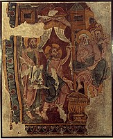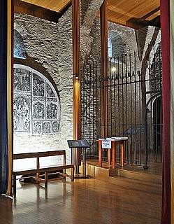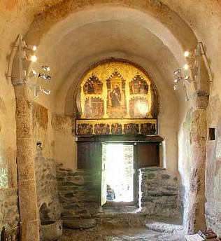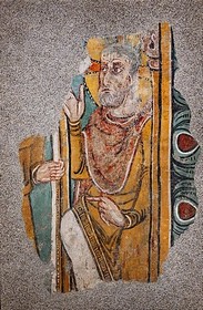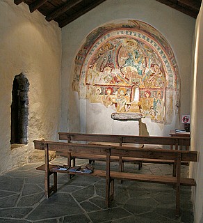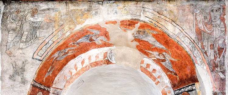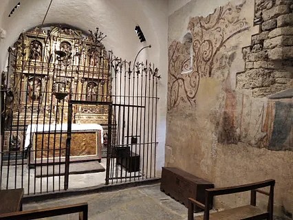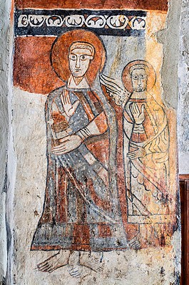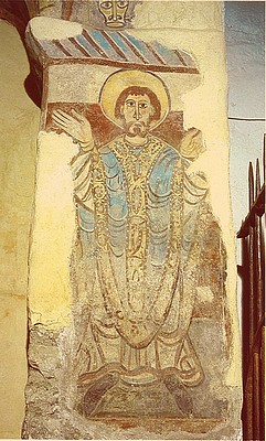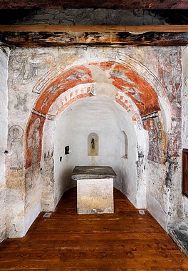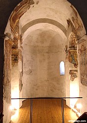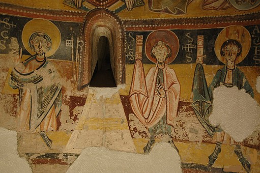4) Sant Cristòfol d'Anyós          A XII. századi templom Andorra egyik legkisebb temploma volt, ma Anyós falu felett mintegy 1 310 méter tengerszint feletti magasságban a Valira del Nord folyó völgyére néző sziklán áll. Az eredeti templom kicsi volt, 5x4 méter méretű, téglalap alakú hajóval és egy félkör alaprajzú apszissal. A XVI. században a hajót magasították, a déli és nyugati falakat lebontották. A román korszakból csak az apszis és az északi fal maradt meg. 1930. körül fedezték fel a templom XII. századi román stílusú falfestményeit, amelyet a Santa Coloma mesterének tulajdonítanak és az egyik legteljesebb korabeli képciklust tartalmazta, amelyet egy andorrai templom belsejében találni lehetett. 1933. táján a freskókat régiségkereskedők leszedték, egy madridi antikvárius, Apolinar Sánchez Villalba vásárolta meg őket, majd 1939-ben kiállították a New York-i Brummer Galériában. Az eltávolított ciklus, amelynek végső sorsa ismeretlen, Szűz Máriát ábrázolta két glóriás szenttel, akiket Péterrel és Pállal lehet azonosítani, a további többszörös adásvételek után a freskóknak nyomuk veszett. Nemrég a "Grál Madonnát" ábrázoló részlet felbukkant (ld. Grál Madonna fejezet).