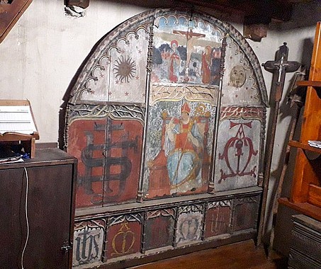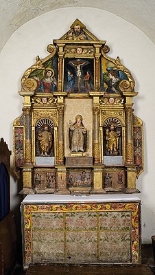 A templom bejárata felett látható egy retabló, amelyet a XVI. század közepén készítettek, és a templom címzetes szentjének szenteltek. Félkör alakú körvonala azt mutatja, hogy az apszisban volt eredetileg, ahol eltakarta az apszis románkori freskóit, ezáltal hozzájárult azok megőrzéséhez. A retabló felületét aranyozott stukkó domborművek képezik, és ezen az alapon öt jelenet látható. Középen Auxerre-i Szent Romà, hatodik századi szerzetes ábrázolása látható. Azonban a széleken levő négy részben látható jelenetek egy másik római szent életéről mesélnek, jelen esetben Antiochiai Szent Romanoszról, aki negyedik századi mártírszent volt, Galerius Maximian császár áldozata volt. Ez biztosan ikonográfiai tévedés, ami nem meglepő, ha figyelembe vesszük, hogy 28 különböző római szent létezik ilyen néven. A predellát öt rész alkotja: közepén egy Krisztus mellszobor található, amelyet mindkét oldalon két-két szintén mellkép formában ábrázolt apostol vesz körül. Balról jobbra haladva Szent Bertalan és Szent András – az első kést tart, a második X-alakú keresztet. Mellettük Szent Péter és Szent Pál, akiket könnyen felismerhetünk attribútumaikról (kulcsok és kardok). A másik oldalon Szent János és Szent Simon ábrázolása van – János borotválatlan, Simon hosszú kínzófűrészt tart a kezében. A predella utolsó tábláján Szent Fülöp és Szent Jakab szerepelnek, akik attribútumként a mártírság keresztjét, illetve a zarándokok kagylókkal díszített botját viselik.
