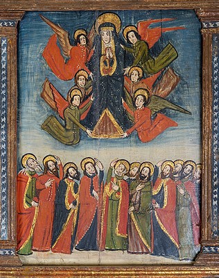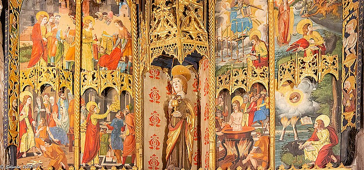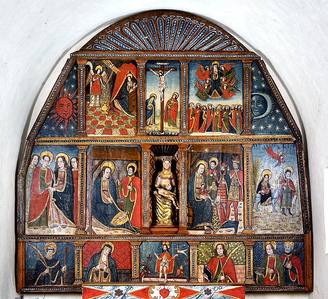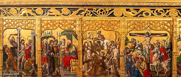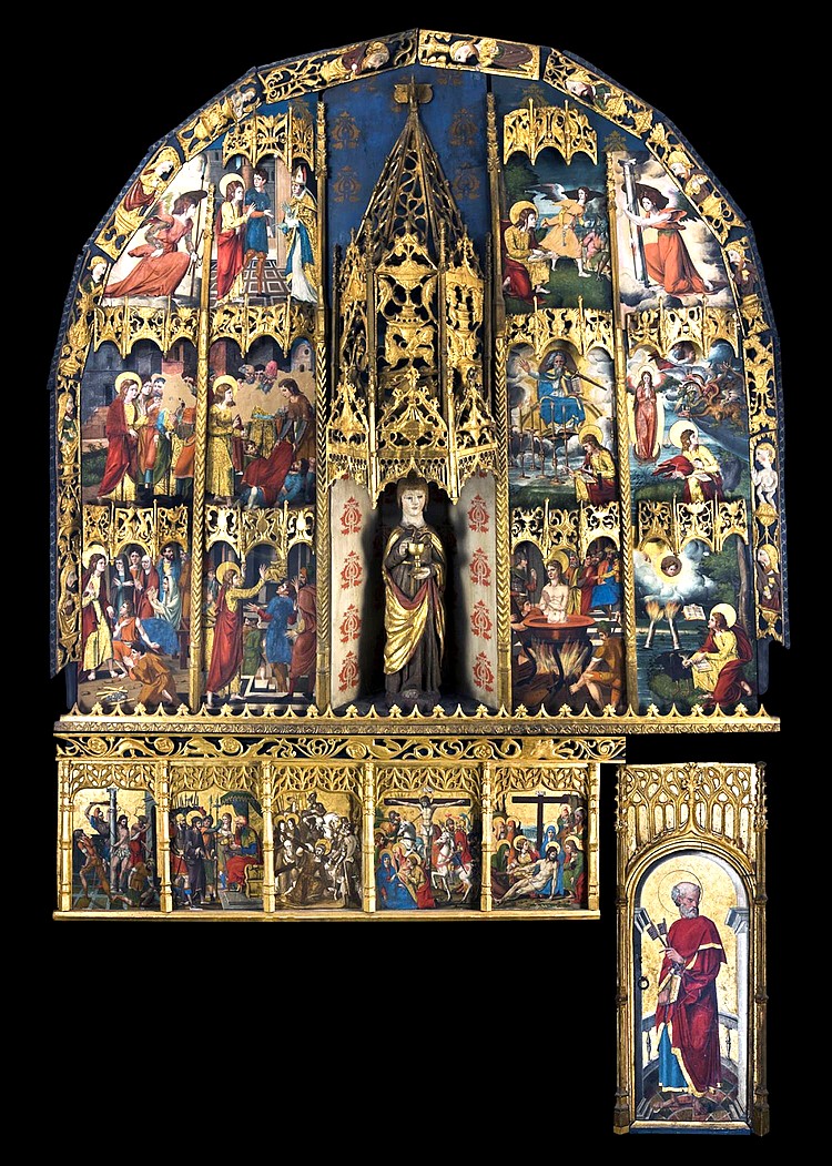Az oltárkép három sorban öt-öt képből áll össze, A képek Szűz Mária életének pillanatait illusztrálják időbeli sorrendben, a főbb események: Erzsébet látogatása, Jézus születése, királyok imádása, menekülés Egyiptomba, Mária mennybemenetele. A tematikus ciklust egy predella egészíti ki, amelyben középen Mária és Szent János evangélista között Krisztus feltámadásának jelenetét szemléljük. Krisztus sírját két alvó katona őrzi. A retabló szerzőségét a Tuixén-i mesternek tulajdonítják a stílusjegyek alapján.