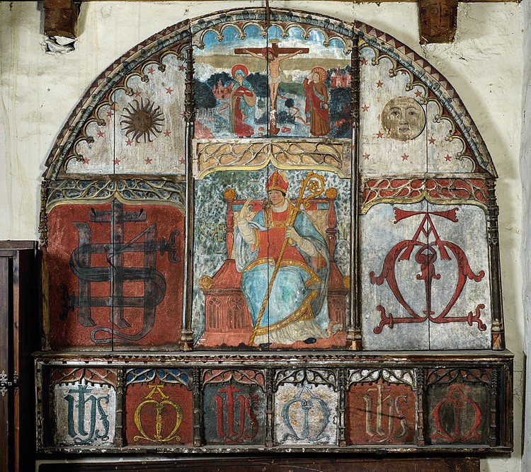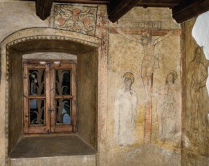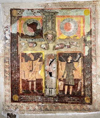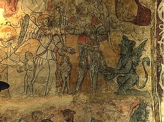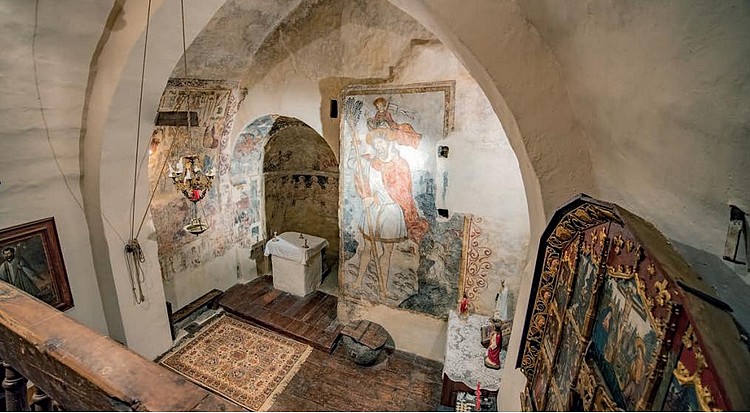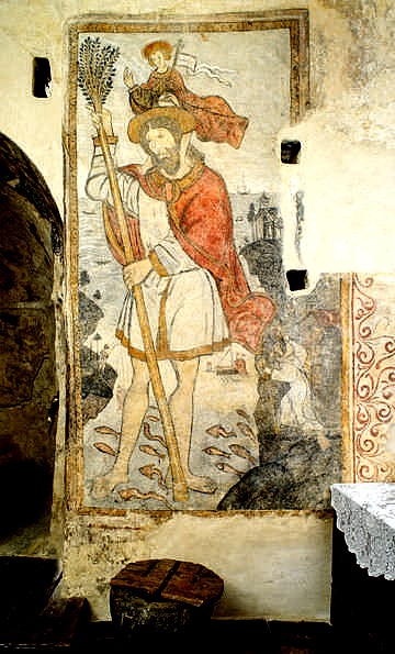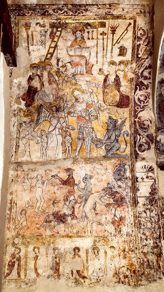Jelenleg a templomban a XIII. és XVI. században született gótikus és reneszánsz falfestmények láthatók. A legkorábbiak az apszisban vannak, az Utolsó vacsorát ábrázolják. A szentély baloldali falán az Utolsó ítélet jelenetei láthatók, a felső részben Szent Mihály lelkeket mérlegel, hogy eldöntse, ki emelkedhet a mennybe és ki bűnhődjön a pokolban az alsó részben. A jelenet az egyiptomi vallásból ered, ahol Anubis mérlegeli a halottak szívét. A szentélytől jobbra Szent Kristóf, a templom névadója van óriásként ábrázolva, ahogy a hagyomány tartja róla.