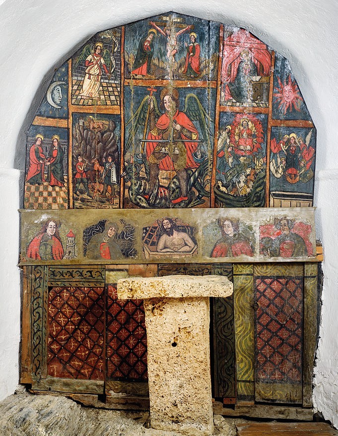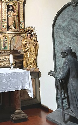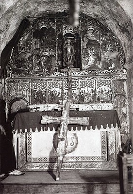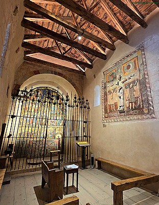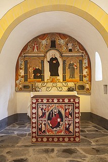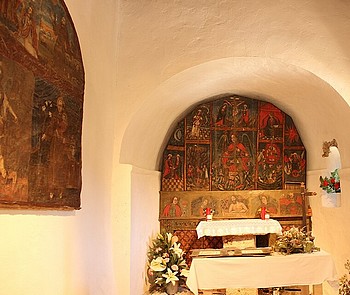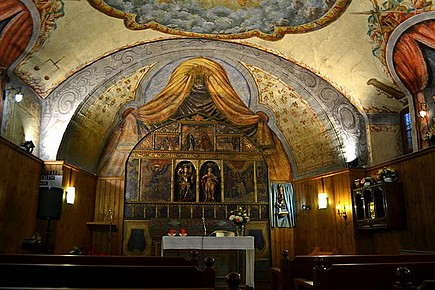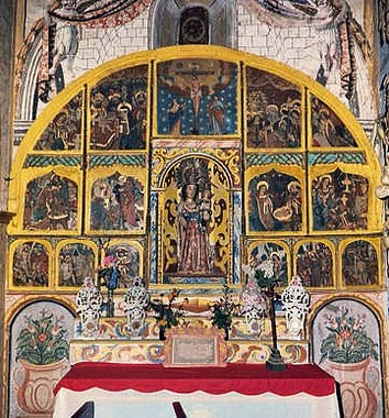A templom leírása és a templomban levő, illetve a templomból származó freskók ismertetése a Grál Madonna fejezet 7) pontjában részletesen olvasható. Alább csupán következzen néhány kép a templomról és a templom barokk retablójáról.