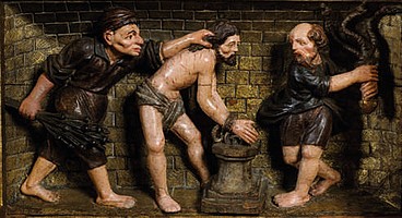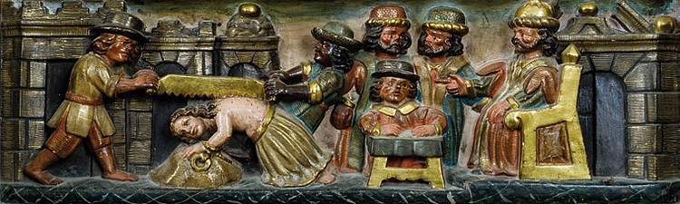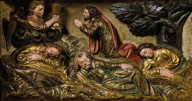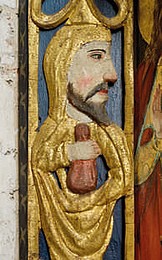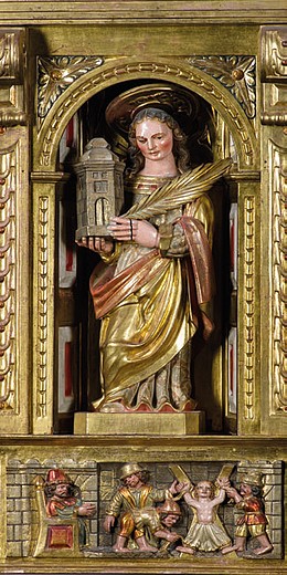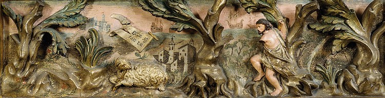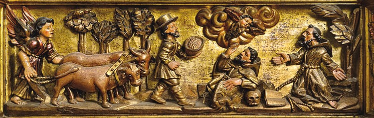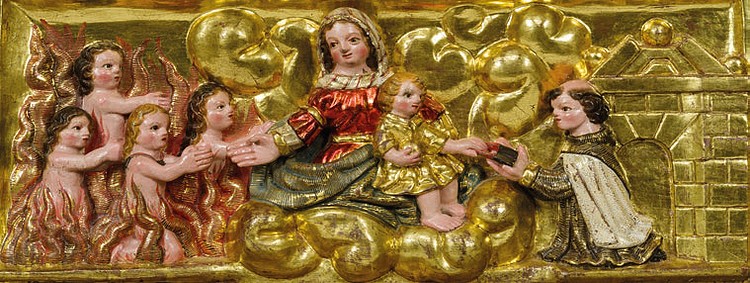 A predella központi domborművén a Karmel-hegyi Boldogasszony a tisztítótűzben álló lelkekkel és Szent Simon Stockkal együtt látható, Simon Stock angol katolikus pap és szent volt, aki a XIII. században élt, és a karmelita rend korai perjele volt. A Szent Simon Stock iránti népszerű tiszteletet általában a Karmel-hegyi Boldogasszony iránti tisztelethez társítják.