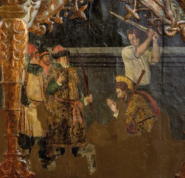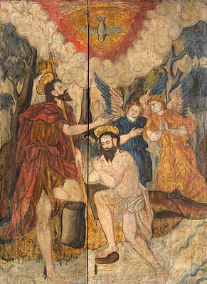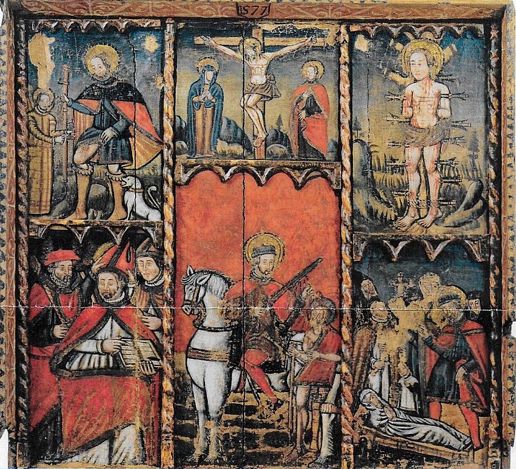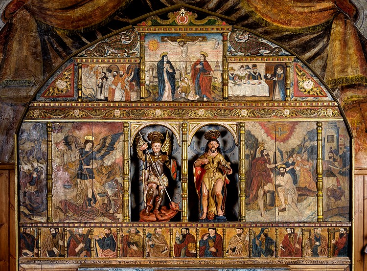 A Szent Mihály és Szent János oltárképének ambiciózus képi ciklusának szerzője technikailag kevéssé képzett művész, például nehézségekkel küzd az alakok anatómiájának hiteles megalkotásában. Mint más mesterek, akik a szerényebb plébániáktól kaptak megrendelést, ez a névtelen mester is a széles körben elterjedt metszetekre támaszkodott, hogy képeinek kompozícióját összeállítsa. Az ő esetében a XVI. század nyolcvanas éveihez datálható flamand metszeteket lehet találni, amelyek az oltár képeinek alapjául szolgálhattak. Így az oltárképen Szent Mihály arkangyal képe ismétli azt az ábrázolást, amit Maerten de Vos rajzolt és Hieronymus Wierix metszett. Másik példa Krisztus megkeresztelése, a flamand művészek alkotását 1584-ben adták ki. A retabló alsó részén a predellán 13 rekeszben Jézus és az apostolok láthatók.
