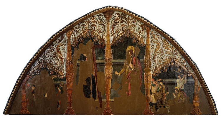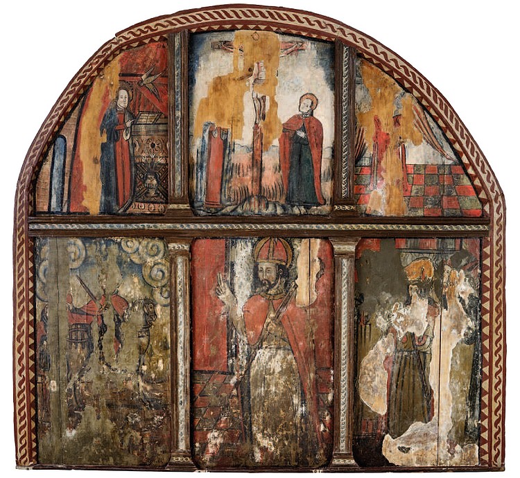 A XV. században a keresztre feszítést kék ég és nyugodt természet alatt ábrázolták, egy olyan világban, amelyet a Megváltó kegyelme vigasztalt, aki a kereszten halt meg, hogy megmentse azt. A jelenet tájképén a hagyományos arany háttér helyét a lakható természet vette át. A nap és a hold szintén gyakran előforduló elemek voltak, akár azért, mert utaltak az evangéliumi írásokra, amelyek elmagyarázták, hogy a sötétség leplét miként borította a nap fénye Krisztus halálának pillanatában, akár azért, mert a mennyei Jeruzsálemet szimbolizálták, amely a háttércsillagokkal együtt a mennyboltot ábrázolta, vagy Krisztus isteni és emberi természetét jelképezték, vagy azért, hogy a legrégebbi feliratok alfa és ómega jelét helyettesítsék, hogy az írástudatlan közönség könnyebben felismerje a csillagokon keresztül az üzenetet, miszerint Isten az Univerzum kezdete és vége. A középkori stílus emlékeztetője még a predellát alkotó hat mező Jézus (IHS) és Mária (MA) anagrammáiban, valamint a retabló első sorának oldalsó tábláin is megfigyelhető. A gótikus betűk gyönyörűen összefonódó kalligráfiája, különböző színű mezőkkel, az illusztrált kéziratok finom világát idézik. A központi táblaképen püspöki trónon, mitrával, pálcával jellegzetes ruházatban ülő alak a templom névadója, San Serni, Toulouse püspöke. A retabló táblái jelentős veszteségeket szenvedtek, a temperával festett felületek általános kopást mutatnak. Sajnos a retabló nem az oltár felett, hanem hátul a karzat alá van téve, lehet, hogy később visszakerül az apszisba.