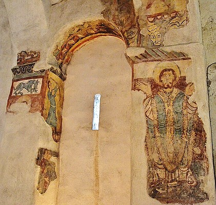 Ezek a festmények nagyon érdekesek a megjelenésük miatt, egyrészt preromán stílusban készültek, de a festett karakterek pedig inkább tovább követték a mozarab mintázatokat (talán a festők inspirációja miatt), a románkori festészet bizánci hatása kevésbé érvényesült, mint sok más andorrai templomban. Ami az ikonográfiát illeti, nehéz értelmezni, mivel a megőrzött elemek hiányosak. A diadalív belső részén felül középen medálban az Agnus Dei (Isten báránya) lehetett, akit kétoldalt angyalok imádnak, lejjebb szentek állnak, a jobboldali szent mellett egy szakállas (?) angyal. A diadalívnek a templombelső felé néző oldalán baloldalt egy madár van, valószínű utalás a Szentlélekre, bár van olyan vélemény is, hogy János apostolt szimbolizáló sasról van szó, és a jobboldalon Mihály arkangyal döfi a sárkányt (ez sem biztos, mivel nincs nimbusz a feje körül és szárnya sincs).