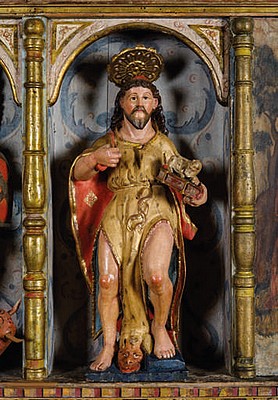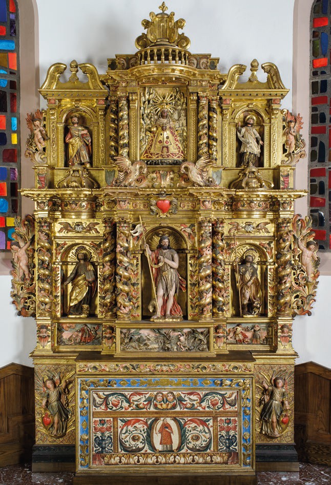 A főoltár barokk retablója annak idején 1707-ben egy magánszemély adakozása révén jött létre és ebből adódóan az ő útmutatásának figyelembe vételével alkották meg. A fülkékben felül középen a Montserrati Szűz Mária, alatta a címadó Keresztelő Szent János alakjai állnak, az oldalsó fülkékben Szent Márk, a felső szinten jobboldalt, a másik oldalon a jezsuita spiritualitással rendelkező Xavéri Szent Ferenc, akire utalnak a talapzat angyalainak pajzsán és a fő párkány közepének lángoló szívei, az alsó fülkékben Szent Péter és a nagy pestis elleni védelmezőként tisztelt Szent Rókus alakjai állnak. A predella három történetéből a legérdekesebb a címadó Szent János a pusztában.