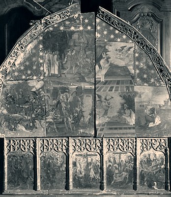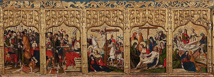 Az oltárkép alsó részét képező predella Krisztus szenvedésének öt jelenetéből áll. 1935-ben az öt jelenetet ellopták, és a későbbiekben csak négyet találtak meg. A központi helyet foglaló változat az elveszett eredeti másolata. Az első kép Krisztus megostorozását ábrázolja, a második képen Pilátus ítélete látható abban a pillanatban, amikor a kezeit mossa. A következő jelenet annak a képnek a reprodukciója, amelyet az 1935-ös lopás óta még nem találtak meg és amelyen Jézus a keresztet viszi. Az utolsó két képen Krisztus keresztrefeszítése, ahol Longinus dárdával szúrja Jézust az oldalába, valamint a keresztlevétel látható (az alábbi képről ez a részlet lemaradt).